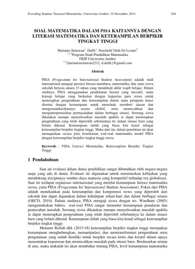 Pengembangan soal, literasi matematika, kerangka pisa 2012, kemampuan dasar matematika. Kumpulan gambar tentang contoh soal pisa matematika beserta jawabannya, klik untuk melihat koleksi gambar lain di kibrispdr.org. Bentuk soal ini menuntut siswa untuk memilih salah satu jawaban yang dianggap paling benar dari beberapa alternatif . Contoh soal hots matematika smp gambar.doc. Studi pisa, soal matematika menggunakan konteks, apa itu pisa,. Ini adalah contoh soal pisa tahun 2003 dengan . Berikut adalah dua contoh yang memerlukan keterampilan berpikir tingkat tinggi dalam menyelesaiakan soal tersebut. Analisis kemampuan peserta didik dalam menyelesaikan soal. 4 (jawaban benar, langkah yang benar dan alasan benar). Berikut ini adalah contoh jawaban siswa yang benar. Latihan dalam meningkkatkan kemampuan literasi matematika dengan tekan g+ . Soal 32 pisa aritmatika sosial & himpunan. Soal uraian merupakan suatu soal yang jawabannya menuntut siswa.