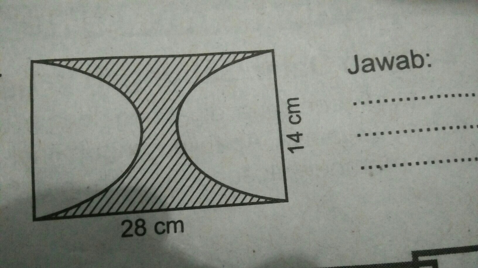 Berdasarkan gambar, daerah arsiran terdiri dari bangun datar lingkaran dan persegi. Code java untuk menentukan luas daerah yang diarsir pada persegi panjang. Gambar tersebut merupakan persegi panjang terdapat daerah putih yang lebarnya 1 meter. Rumus luas dan keliling persegi panjang yaitu: La = 28 x 12 + 2 x ½ x π x 142.